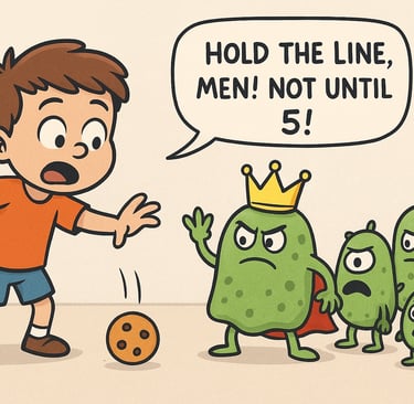 In our cartoon, we imagined a “King Germ” holding the other germs back like, “Hold the line, men! Not until 5!”